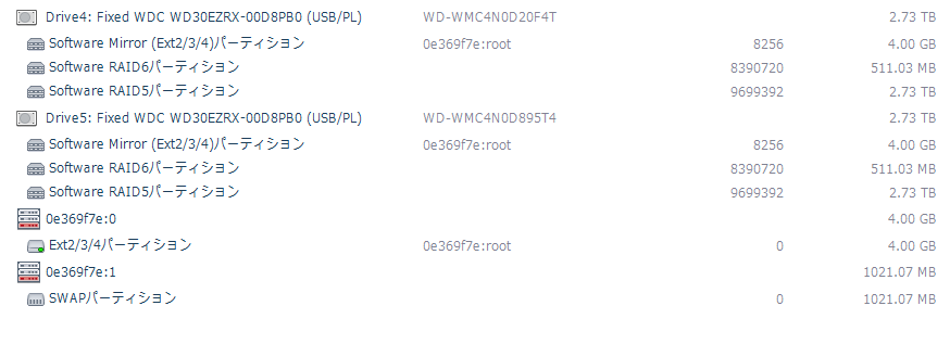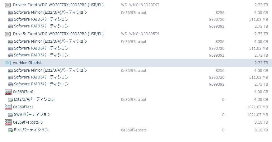 HDDスタンドに2ドライブをセットした状態で認識されたのはExt4パーティションと、SWAPパーティションの2つだけ。ここに3台目のHDDイメージを読み込むと…。