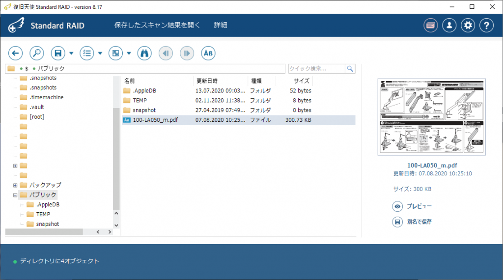 とりあえず、ソフトウェアツールでなんとかしようとBtrfsパーティションを読み込めるツールをいくつか試したものの、RAIDに対応しておらずダメ。そんな中、「復旧天使」という復旧ツールを見つけて使ってみたところ、ディレクトリ構造まで確認できたので、必要なファイルが存在するかどうかは確認できました。