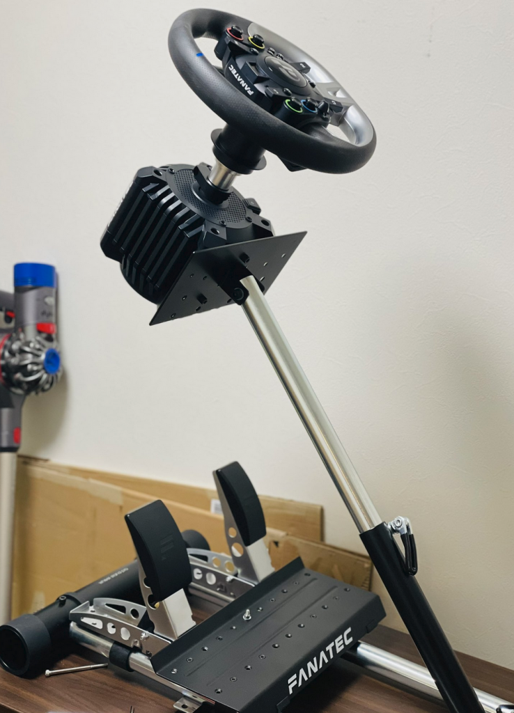 Fanatec DD Proを購入した時に、一緒に揃えたホイールスタンド。付属のM6x80のボルトではDD Proを固定できないので、M5x80のボルトをホームセンターで買ってくれば固定できます。見た目以上に剛性があって、折りたためるので良き。