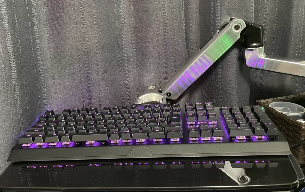 こちらもDD Proの導入がきっかけで、PCデスクの天板下に格納するタイプのキーボードトレイが使えなくなったため導入。昔使っていたエルゴトロンLXモニターアームのポール・クランプ部分とニコイチで使っています。キーボードトレイに両手を乗せてもアームが動いたりせず、しっかりしています。